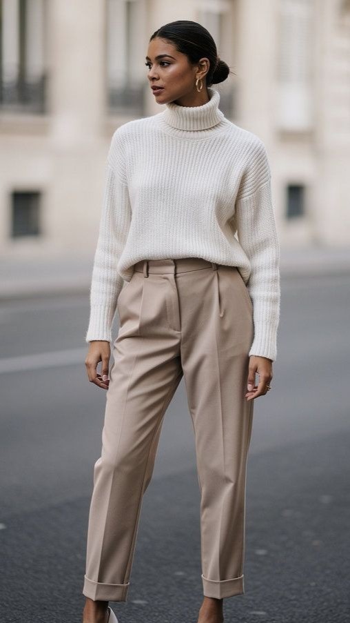 Crie camadas visuais: misture o branco puro com o creme, o areia com o caramelo, o off-white com o cinza-pedra. Esse degradê suave cria profundidade e alonga a silhueta de maneira elegante, demonstrando um olhar apurado para a composição cromática.