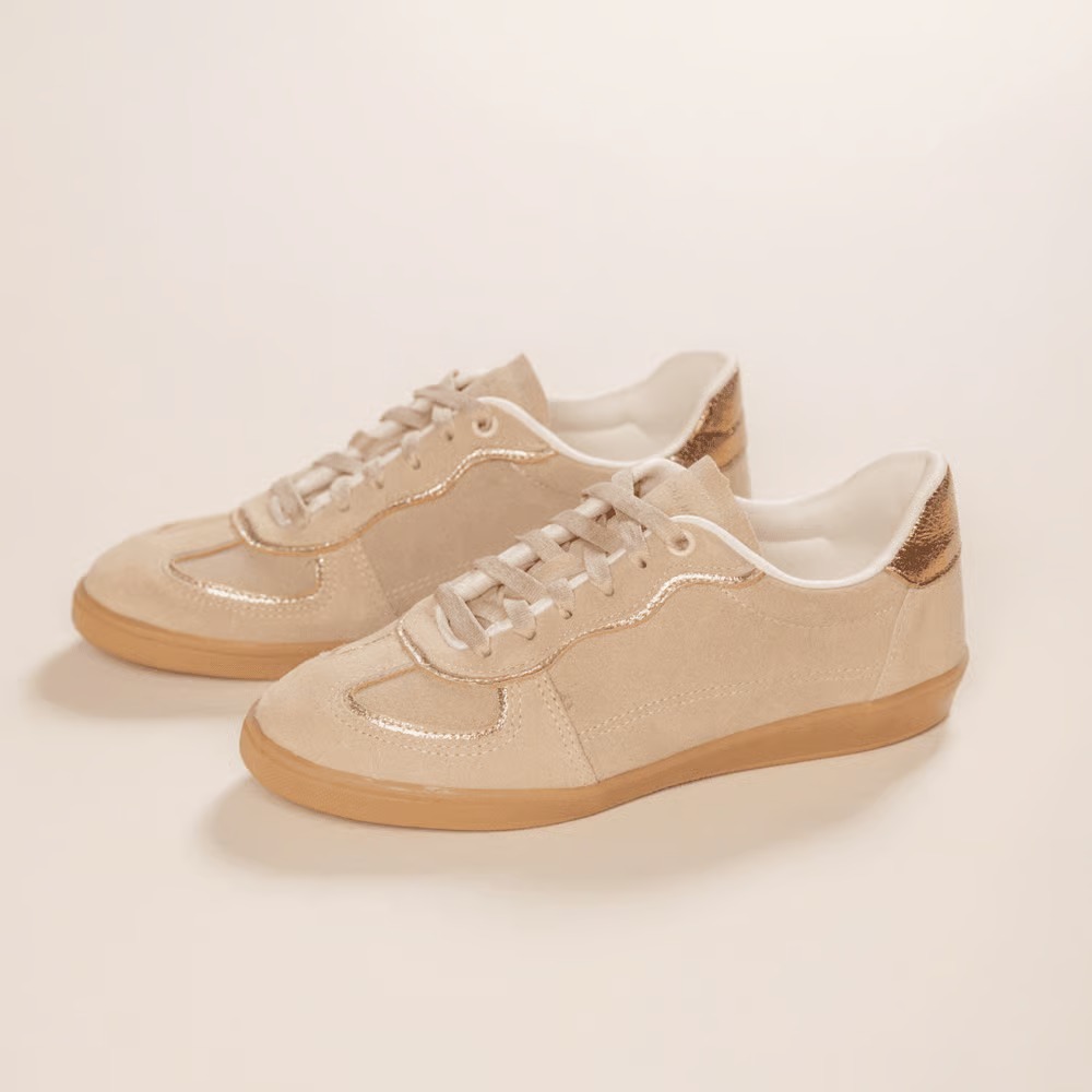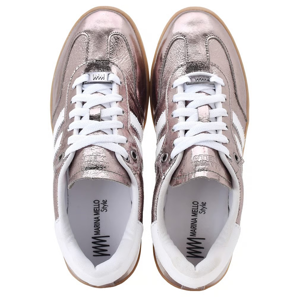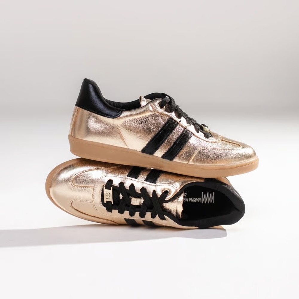 Para ambientes criativos: O tênis metalizado (ouro ou prata) substitui o salto alto com brilho e personalidade, elevando o combo básico de jeans + camisa branca.